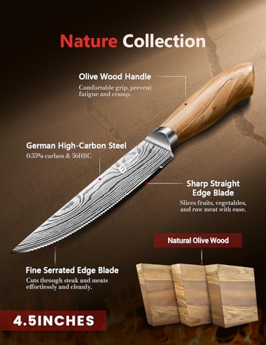 Click for More Images ?Premium German Steel?The steak knife set is crafted from German high-carbon stainless steel, renowned for its anti-corrosion properties, toughness, and high hardness (HRC55±2). Serrated steak knife set can be used as a...