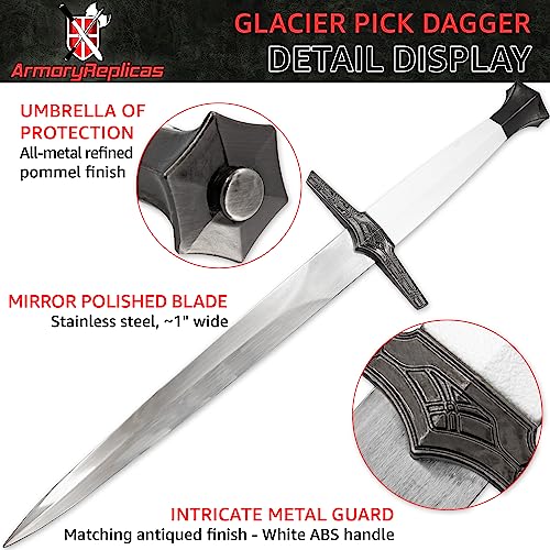 Click for More Images EXCELLENT CRAFTMANSHIP: The Glacier Pick Medieval Inspired Dagger has a gleaming stainless-steel blade and a snow-white handle. The guard is carved in beautiful geometric patterns and the pommel extends out into a hexagon...