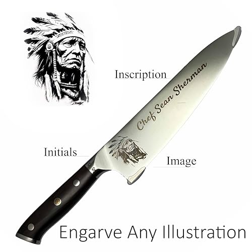Click for More Images Unique Image engraved Chef knife with 8.5" blade, Full Tang and Mosaic ButtonAll engraving is done with CNC controlled Fiber laser that permanently marks knife with texture and depth that sparkle.Elegant black Hardwood...