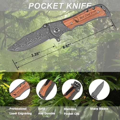 Click for More Images ENGRAVED POCKET KNIFE: Treat your special someone to a truly unique gift with our folding knife. With the message "BEST DAD EVER" intricately engraved on the handle, this custom knife is a heartfelt expression of love and...