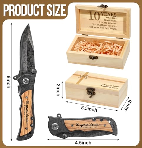 Click for More Images 10th Wedding Anniversary Gift: you will receive a lockable wooden box padded with raffia and containing an olive wood handled Damascus grain folding knife, this 10 year tin anniversary gift is beautifully packaged in a gift...
