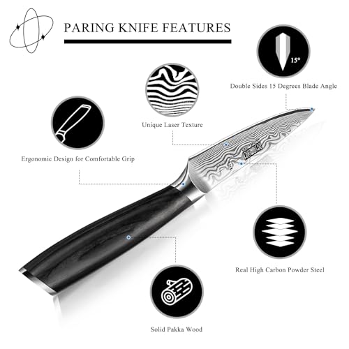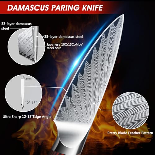 Click for More Images 67-Layer Damascus Paring Knife - HOSHANHO paring knife is forged with 66-layer damascus super steel and a Japanese 10Cr15CoMoV cutting core, with a rating of 62-64 HRC to ensure flexibility and maximum edge retention without...
