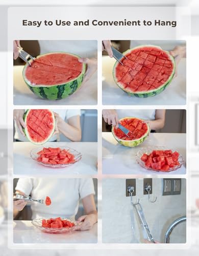 Click for More Images ? 2-in-1 Watermelon Fork Slicer Cutter: Fruit cutter and fork in one! The cubing square blade effortlessly cuts watermelon, cantaloupe, and other melons into cubes. Flip it over to use the fork for serving and enjoying—no...