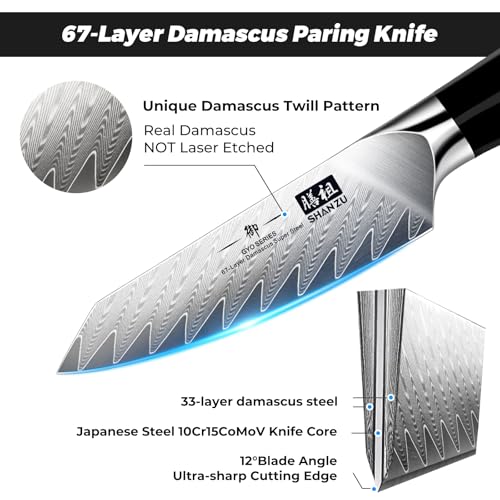 Click for More Images ?Japanese Steel Core, Super Sharp?SHAN ZU paring knife is forged from Japanese Damascus steel 10Cr15CoMoV, has high hardness (62 HRC), is corrosion-resistant, and wear-resistant. Moreover, the 15° V-shaped cutting edges on...