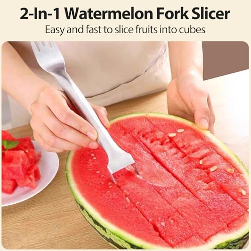 Click for More Images ?2-in-1 Stainless Steel Fruit Cutter?This watermelon slicing fork features a 2-in-1 design that cleverly combines a fork and a slicer. Use it not only to easily slice watermelon into cubes, but also to enjoy it directly with...