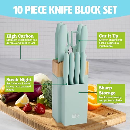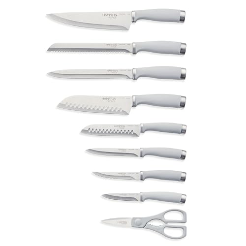 Click for More Images 10-PIECE KNIFE SET: Includes a 8" Chef Knife, 8" Bread Knife, 5" Utility Knife, 3.5" Paring Knife, four 4.5" Steak Knives, Kitchen Shear, and a sleek knife block for safe and stylish storage.SUPERIOR PERFORMANCE:...