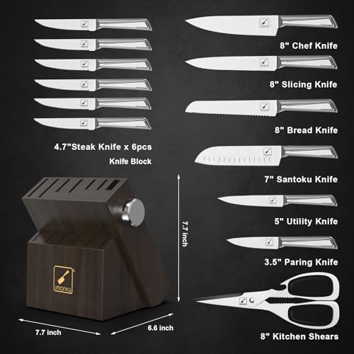 Click for More Images The set includes one 8-inch chef knife, one 8-inch bread knife, onne 8-inch slicer knife, one 6.5-inch carving fork, one 6.5-inch santoku knife, one 3.5-inch paring knife, six 4.5-inch steak knives, one pair of kitchen...