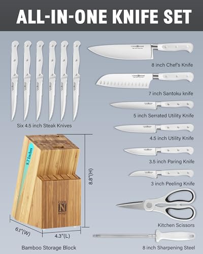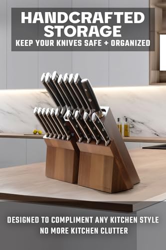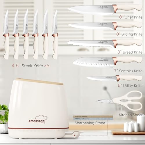 Click for More Images ?Exclusive Built-in Sharpener?Knife set for kitchen with block and sharpener is amazing. The built-in sharpener saves you from having to honing blades on a sharpening steel.?Extra Sharp Knives set?Constructed from durable,...