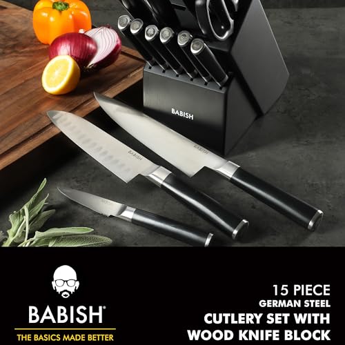 Click for More Images Premium Materials and Quality Feel: Incredibly sharp, full-tang, high-carbon German stainless steel with a hand-polished edge at 16-18 degrees per side makes this steak knife block a must-have. With a Rockwell hardness...