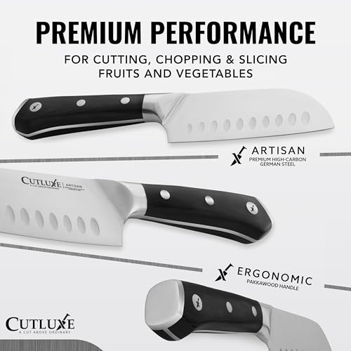 Click for More Images Santoku style 7-inch fine edge blade--great for slicing, mincing and dicingDimpled impressions prevent sticking--reduces suction and drag when slicingHigh carbon steel--durable and stays sharp, hand washing...