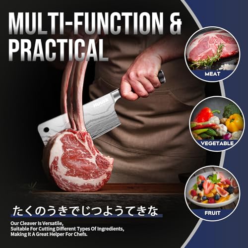 Huusk Meat Cleaver Knife 7 inch, Japanese Butcher Knife for Meat and Vegetable Cutting, Chopping Knives with Ergonomic Handle for Kitchen and Camping, Christmas Gifts