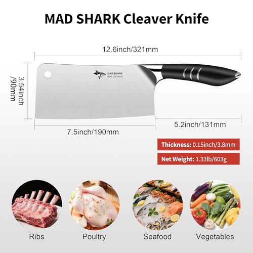 MAD SHARK 7.5 Inch Meat Cleaver Knife, Professional Bone Chopping Butcher with Heavy Duty Blade, German Military Grade Composite Steel, Chinese Chef’s Bone Cutting Knife for Home Kitchen & Restaurant