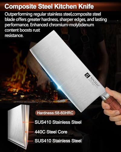 XINZUO 8.1 Inch Professional Chinese Chef Knife,440C Steel Core,Sharp Stainless Steel Vegetable Cleaver Meat Kitchen Square Knife For Precision Slicing, Dicing,Asian Cuisine With Red Wood Handle