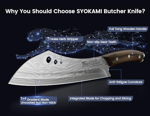 Click for More Images 2-in-1 Blade Design: Incredibly razor sharp, full-tang, imported high-carbon steel with a hand-polished edge at 15 degrees per side (between the sharpness of a chef knife and a cleaver), Integrated blade for chopping and...